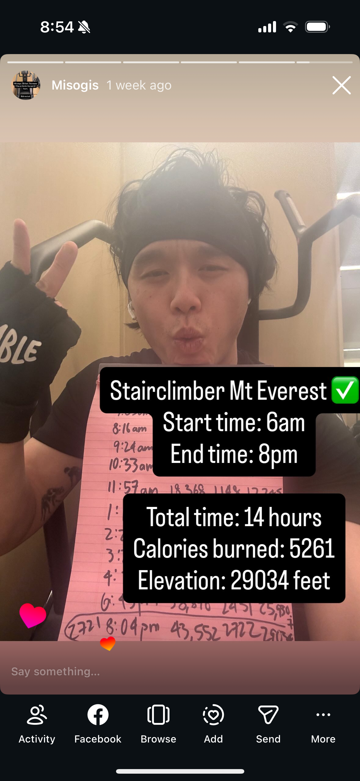 Fast forward, 9 months post surgery, I climbed the height of Mt. Everest on my stair climber in a single session (lol). I climbed from 6am to 8pm, 14 total hours, 5261 calories burned and 29k feet of elevation. Hard to imagine six months ago, I was relearning how to walk.