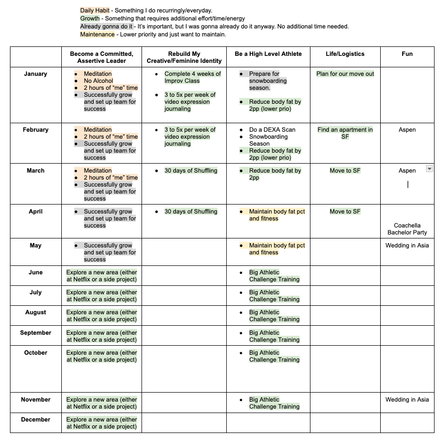 Now that I’ve written these goals, I need to slot them in through the year. I’ll leave H2 up in the air since things could change. But for Q1, the main thing for me to get going is rebuilding my creative identity and building key habits for discipline. I color coded these goals based on how much additional effort it’ll require:
